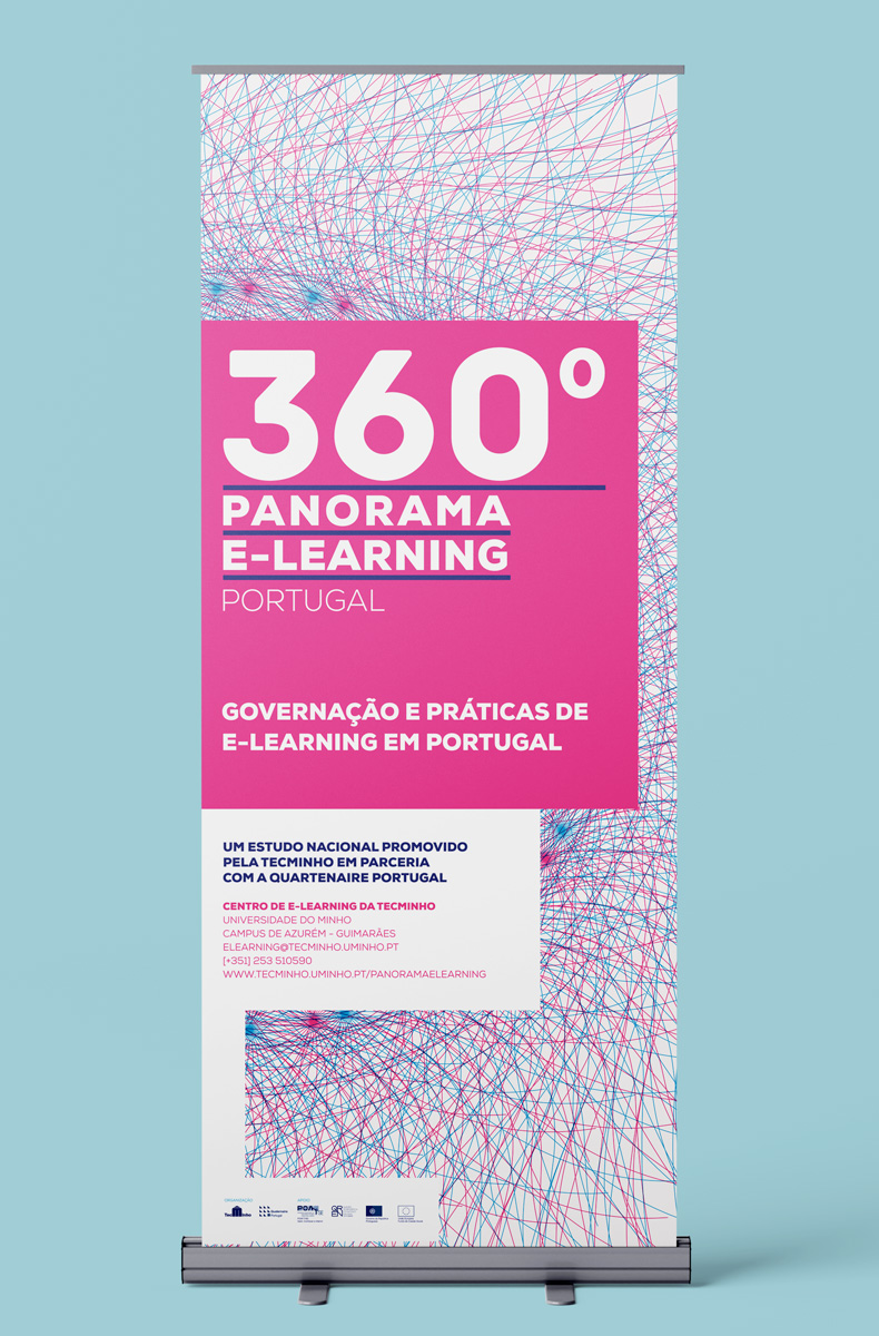Identidade, cartaz desdobrável, roll-up banners, website e relatório anual para “360° Panorama E-Learning”, um estudo exaustivo sobre o e-learning em Portugal.
