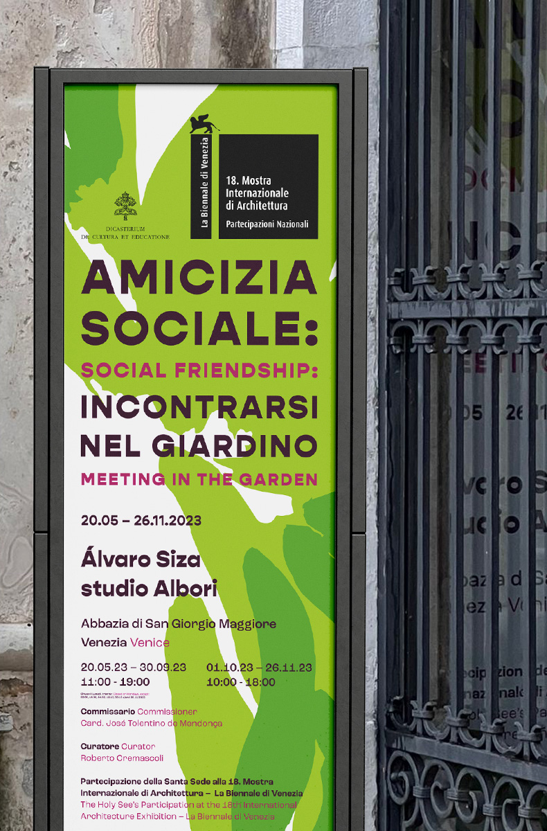 Identidade gráfica e catálogo para a exposição “Amicizia Sociale: Incontrarsi Nel Giardino” (Amizade Social: Encontro no Jardim) de Álvaro Siza e studio Albori no pavilhão da Santa Sé na 18.ª Exposição Internacional de Arquitectura – La Biennale di Venezia.