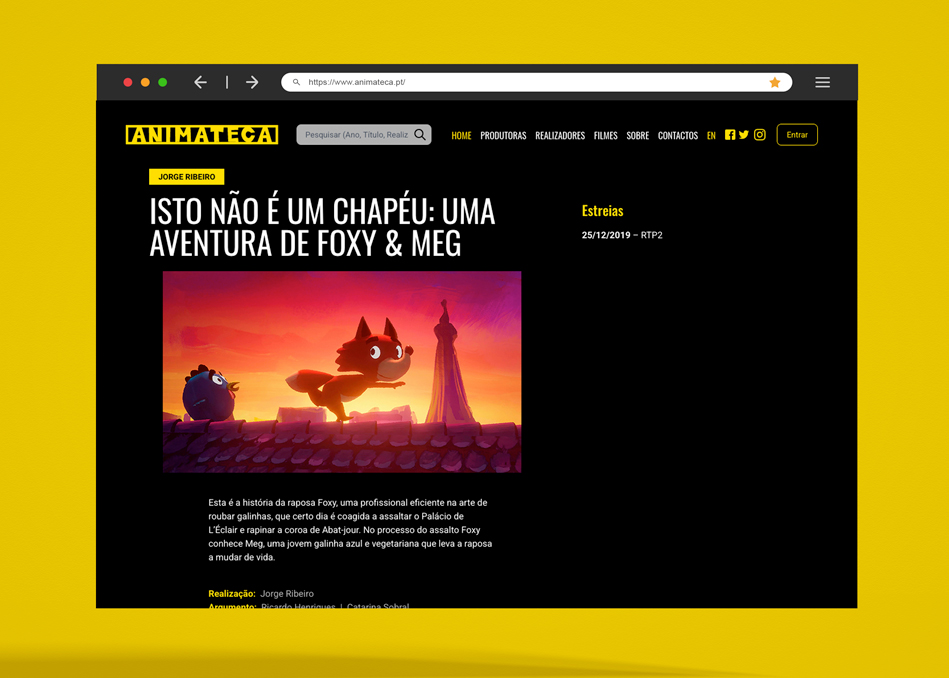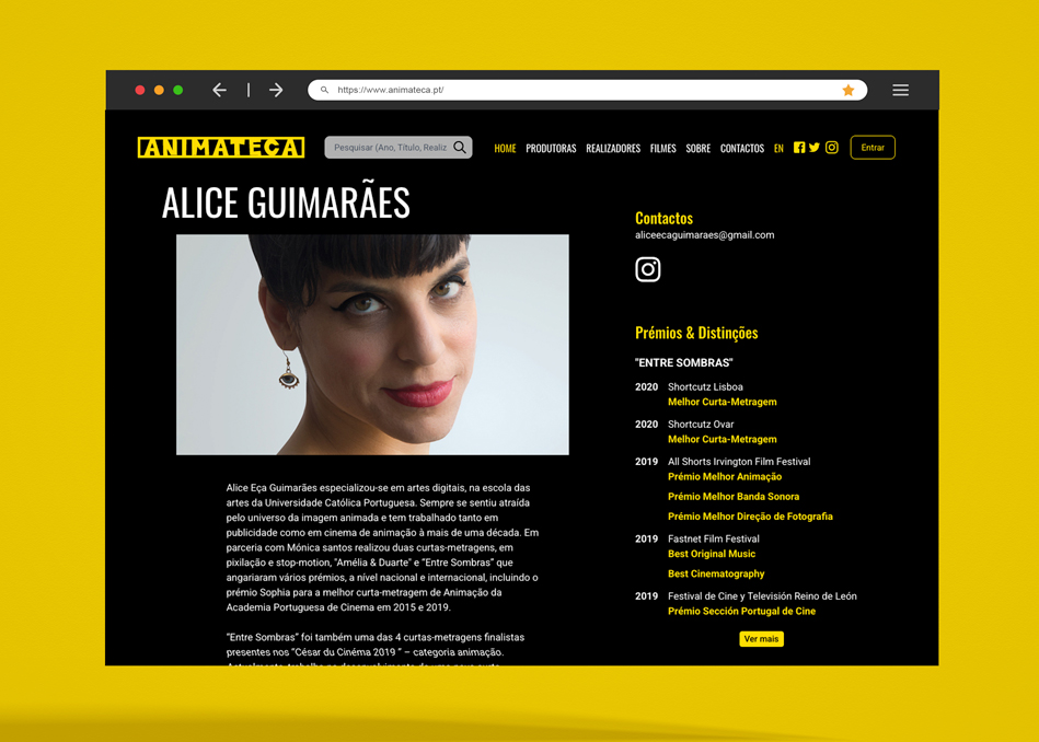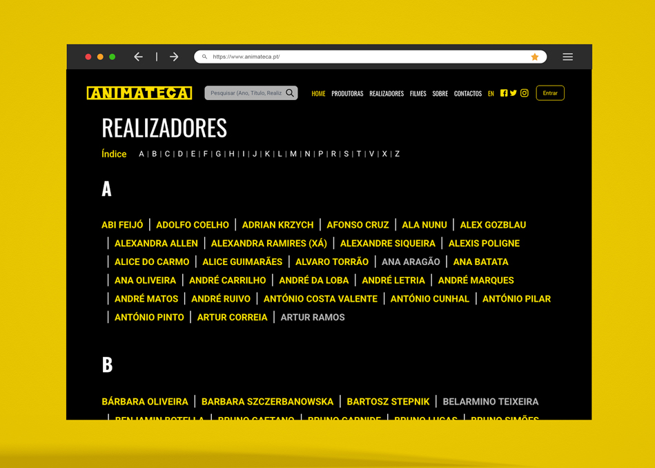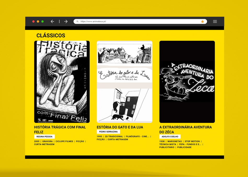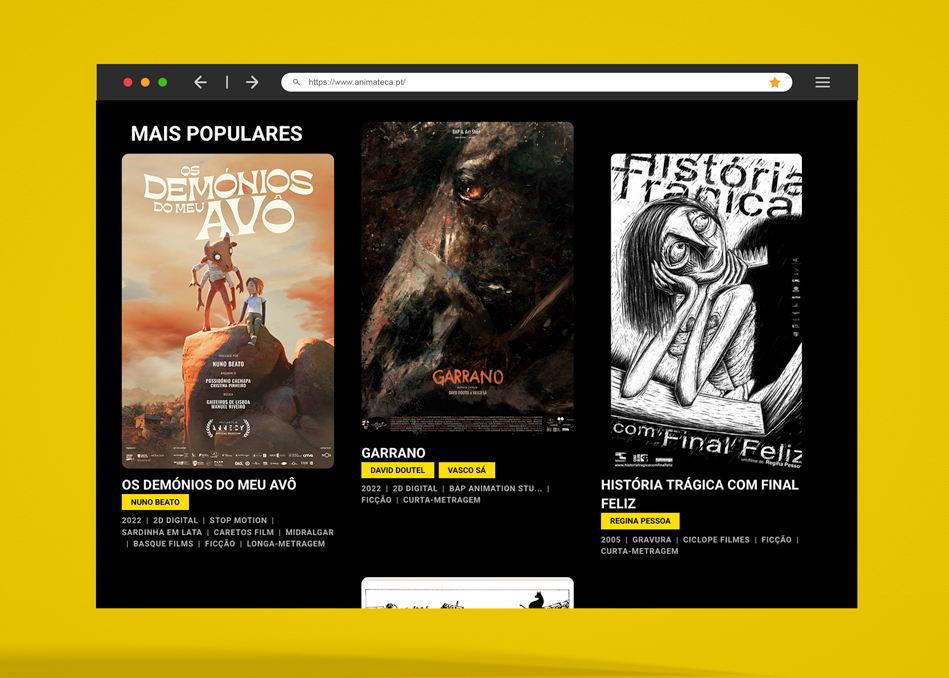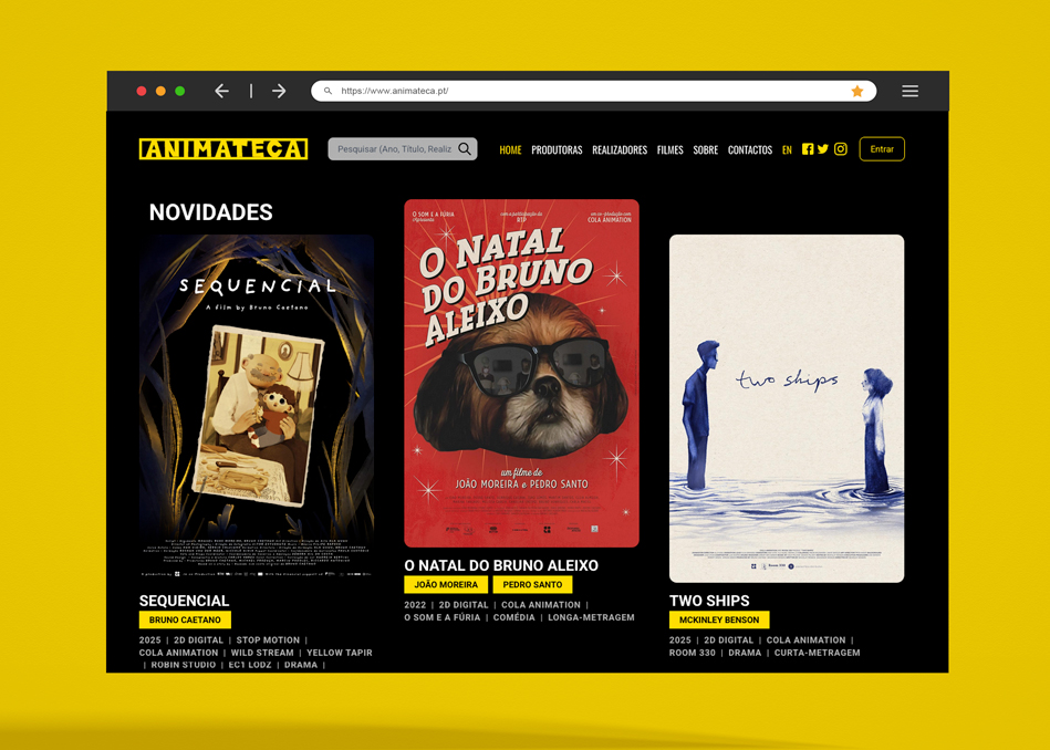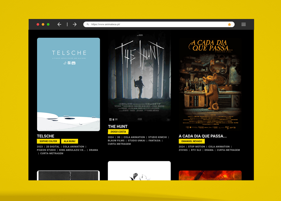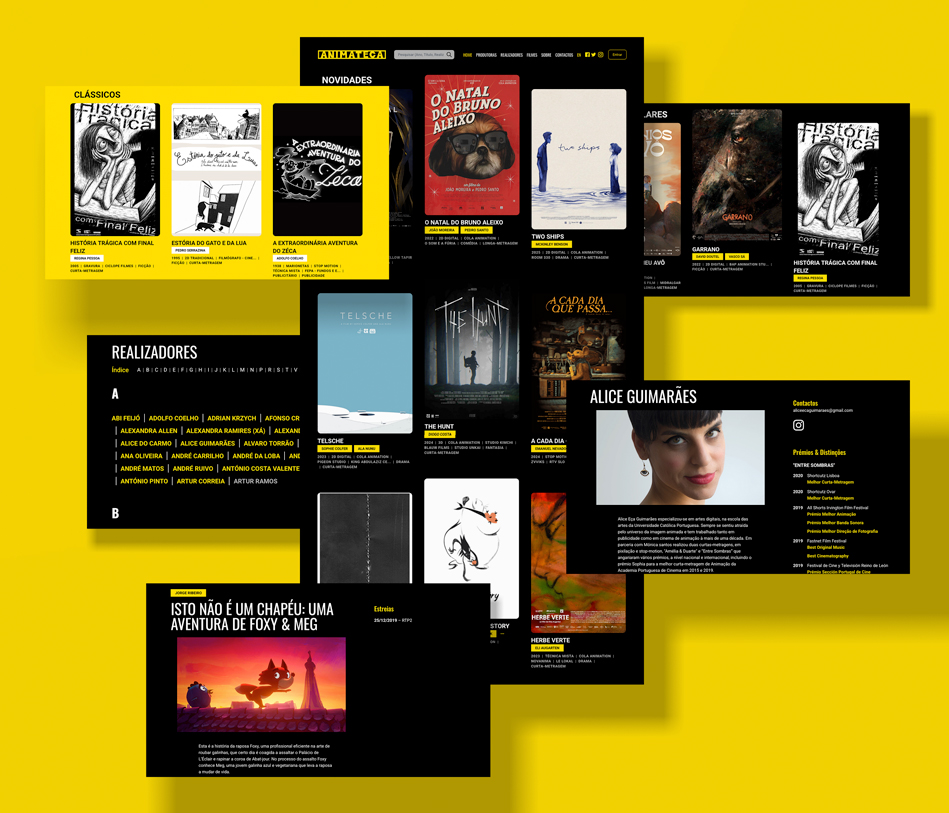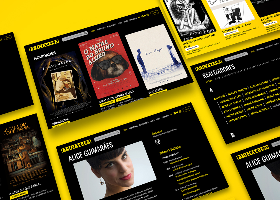 The visual identity and logo were developed in continuity with Casa da Animação’s existing identity, adapting its graphic language to a digital context. The interface was designed to support exploration and cross-referencing, allowing users to move between works, filmmakers, and production companies through multiple entry points. Rather than a static repository, the platform functions as a living reference for anyone working with or passionate about Portuguese animation, from festival programmers and filmmakers to students and fans.