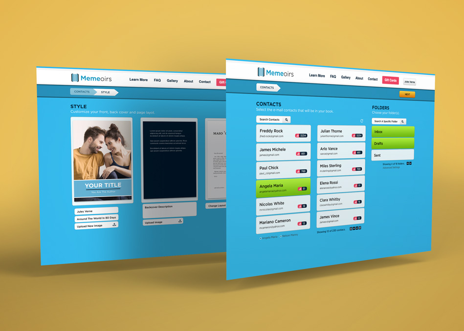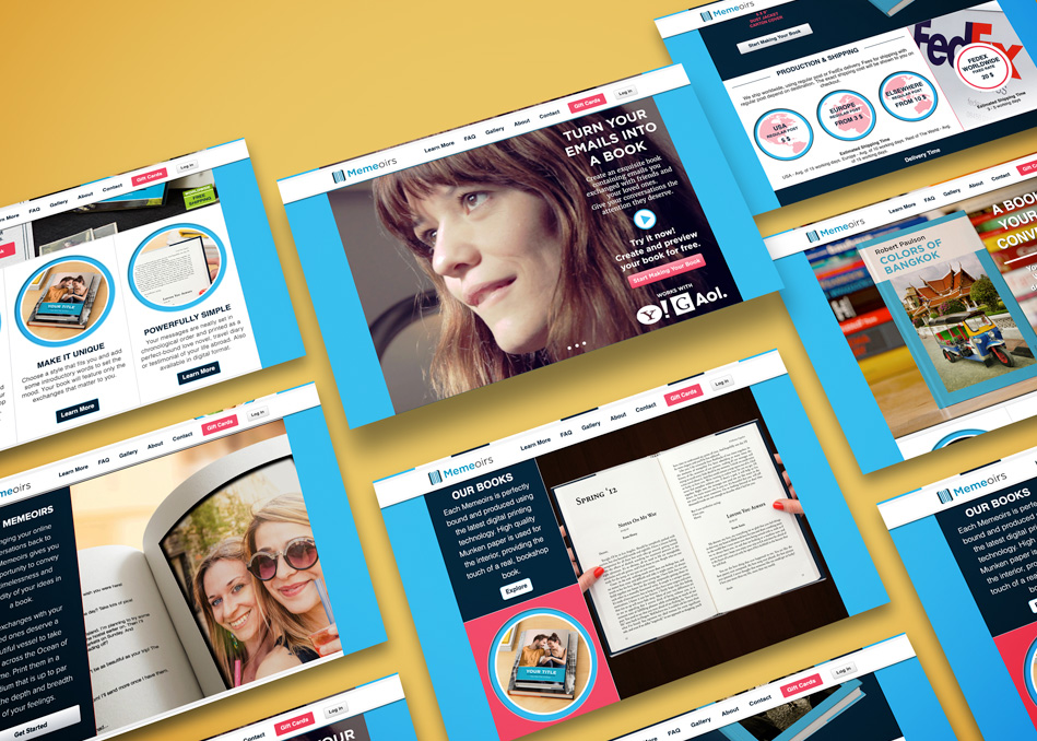 Full-scale design for Memeoirs, an Italian Print on Demand platform that turned email and social media conversations into physical hardcover books. The work covered everything: brand identity, web app design (UI/UX), and the editorial layouts for the final printed books.